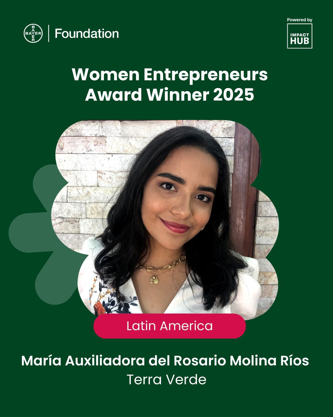 Honduras, Noviembre 2025 – María Auxiliadora Molina, fundadora de Terra Verde, fue reconocida como una de las 15 ganadoras a nivel mundial del Bayer Foundation Women Entrepreneurs Award 2025, un galardón que destaca a mujeres líderes que impulsan soluciones innovadoras en seguridad alimentaria, salud y sostenibilidad.